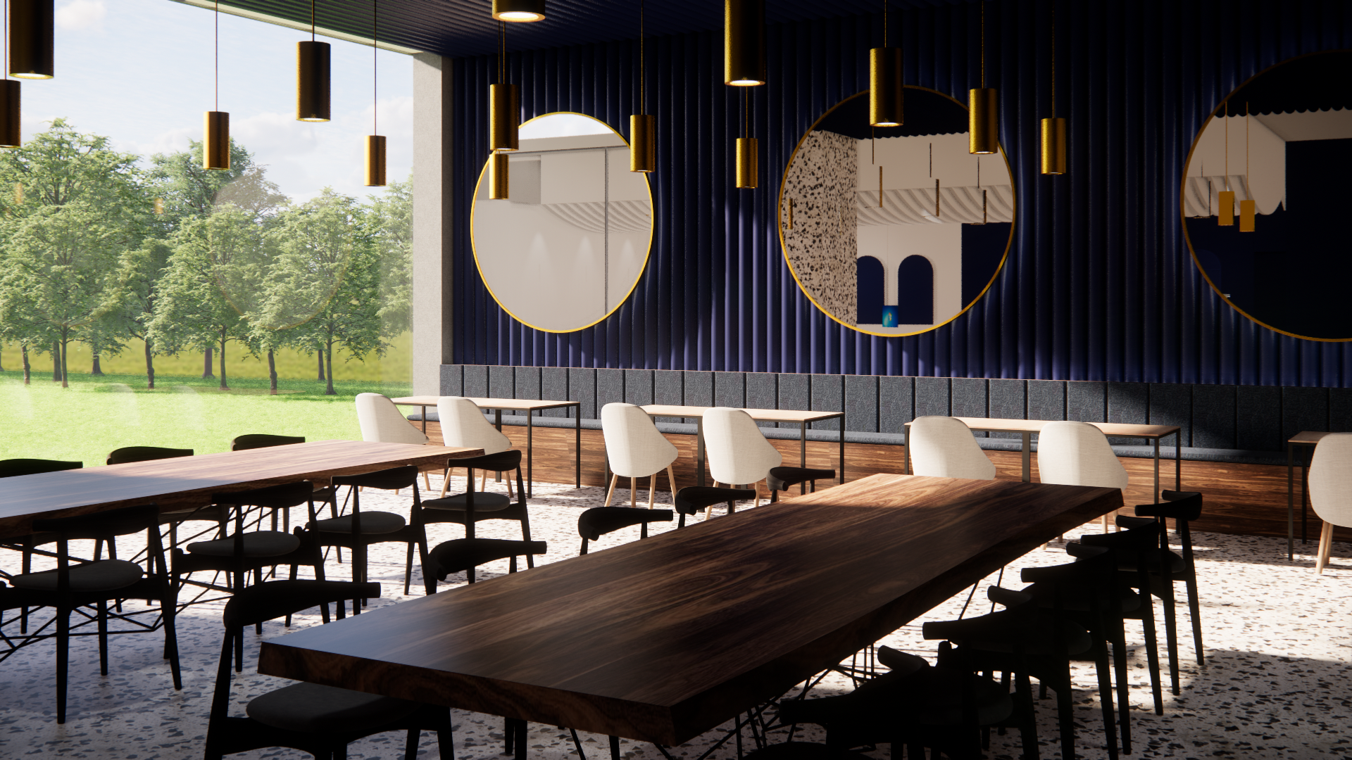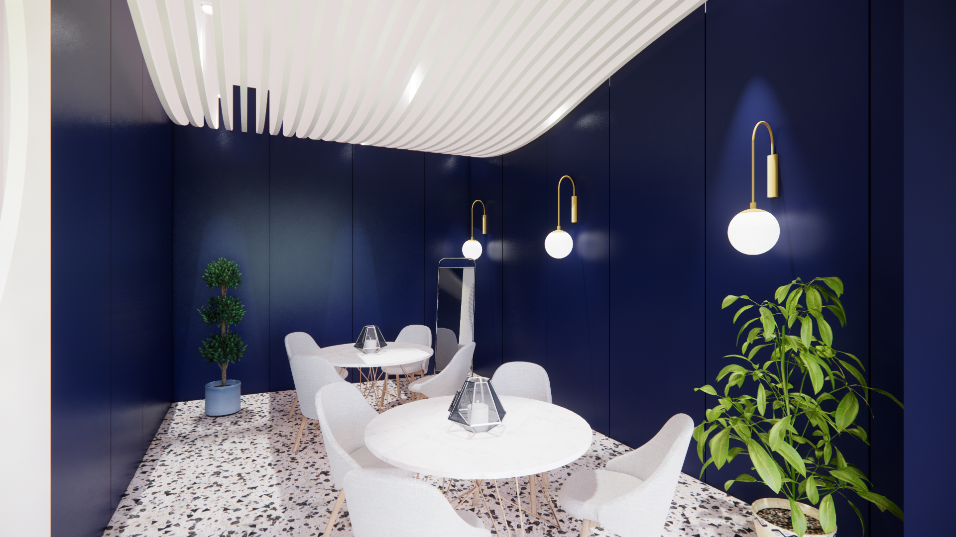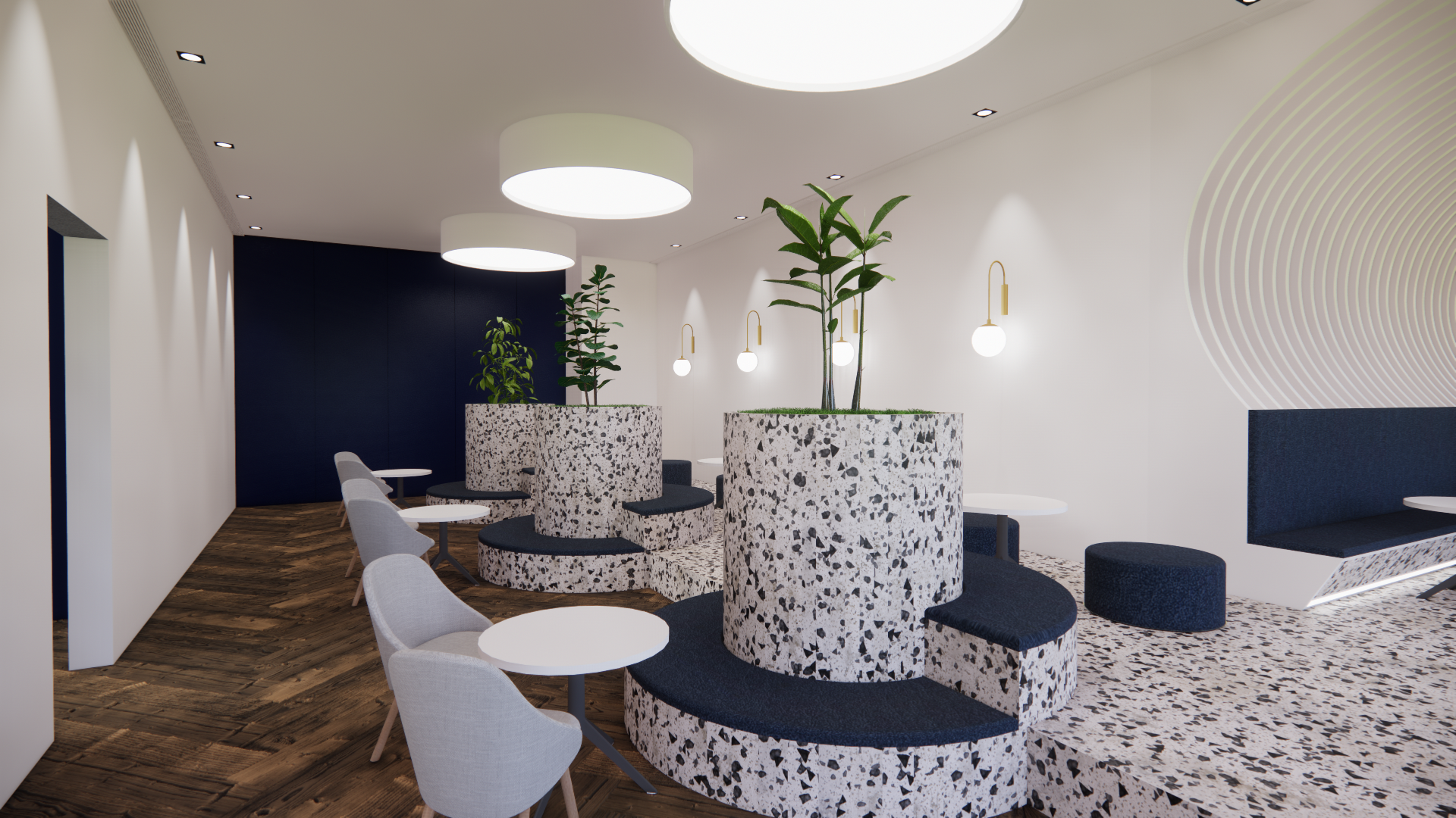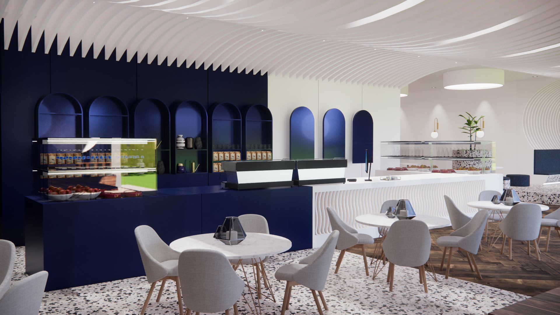 곡선형 천장 루버와 테라조 바닥재의 조화를 통해 역동적이면서도 편안한 휴식 공간(Lounge)을 시각화(Visualization)했습니다.